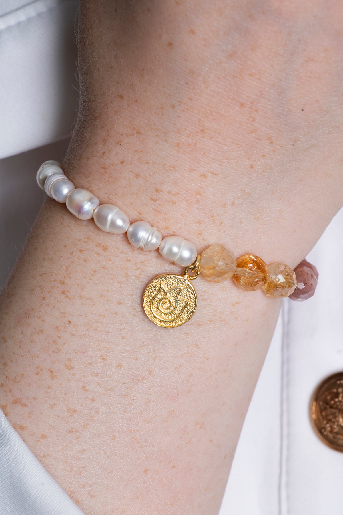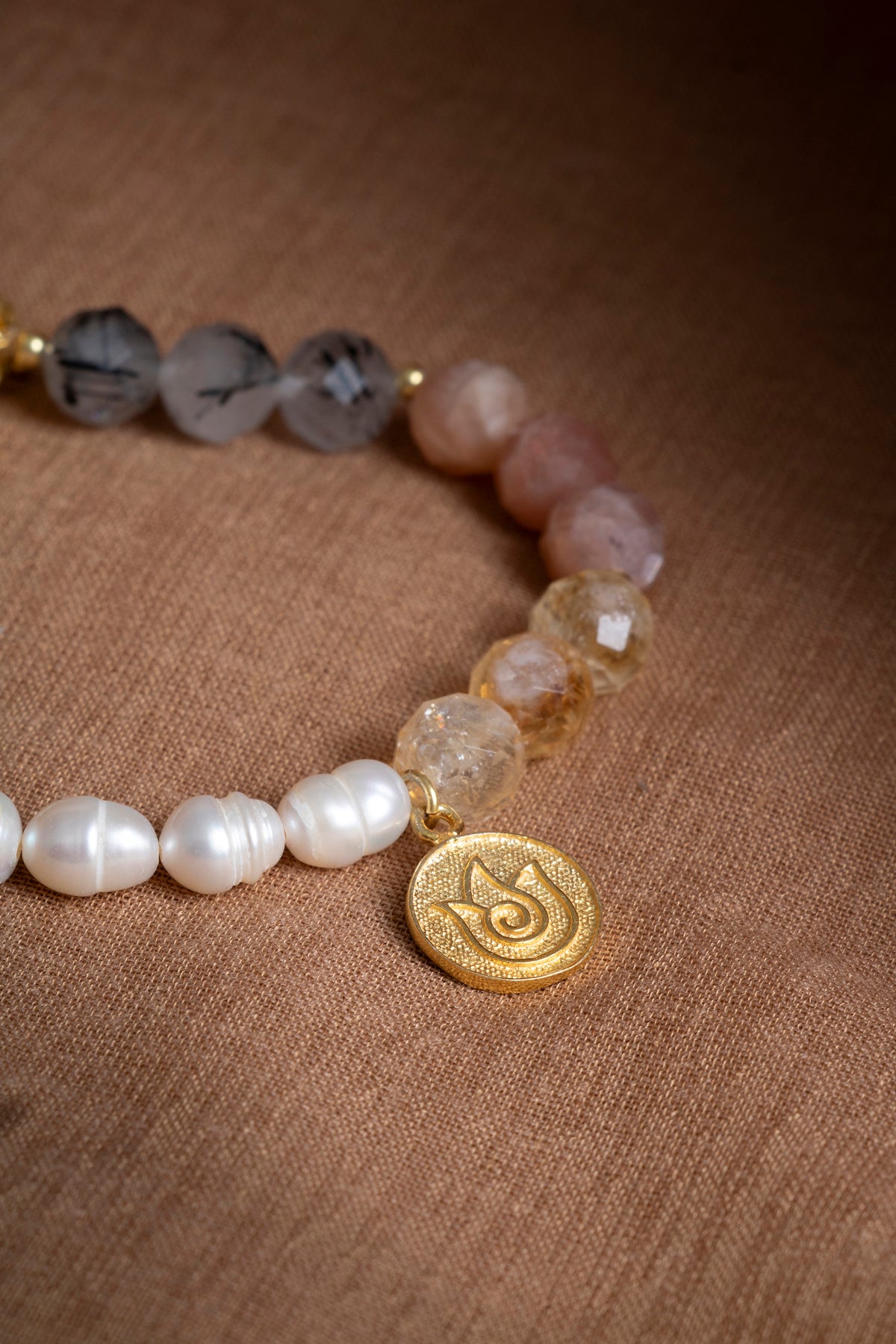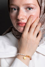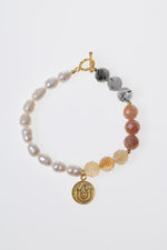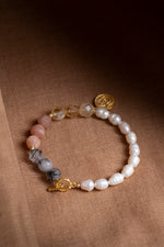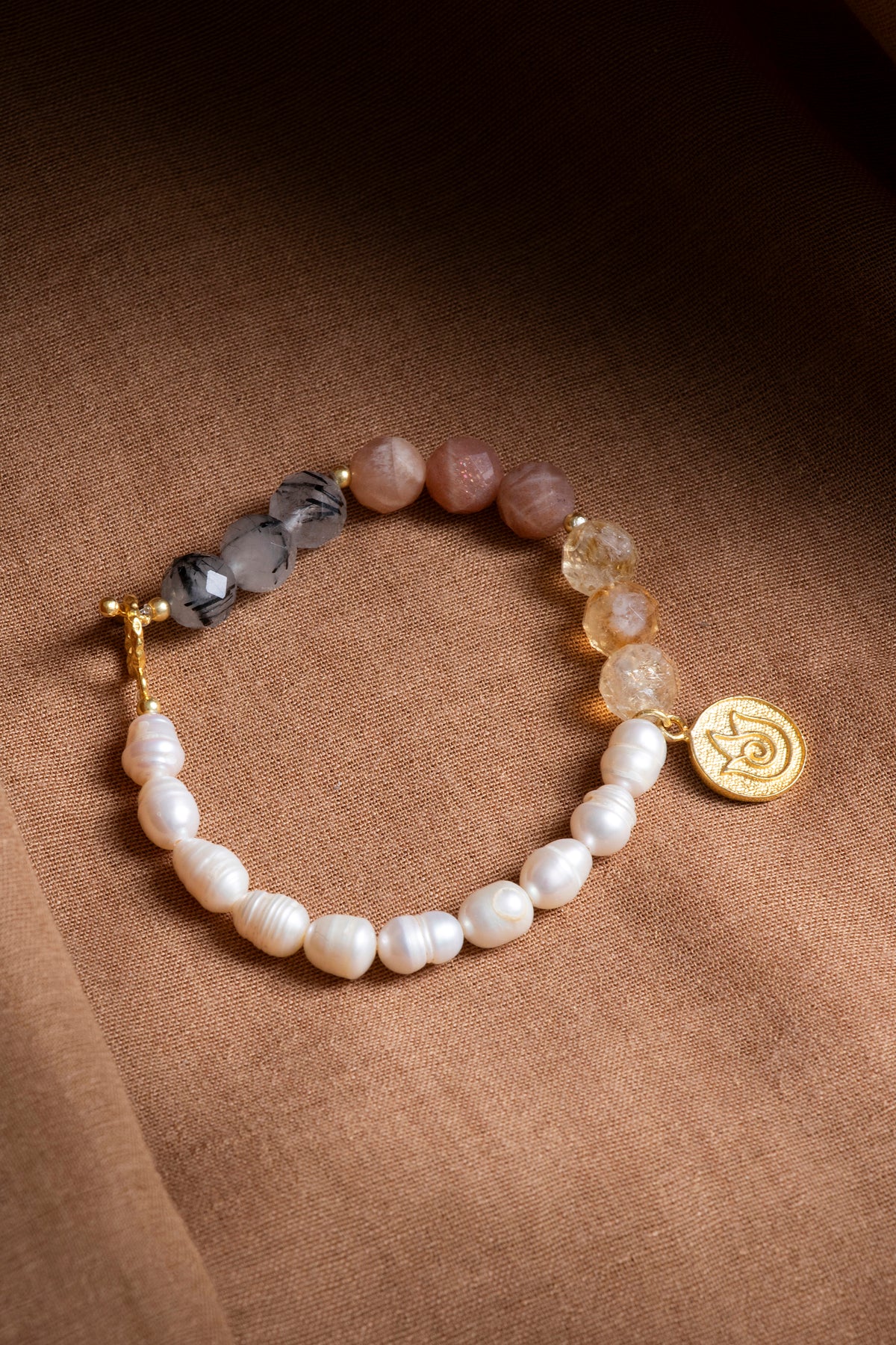 SAKRAL ÇAKRA Bilekliği: Güneş Taşı, Sitrin, Rutilli Kuvars, İnci Gümüş Charm ve Aparatlı Doğal Taş Bileklik