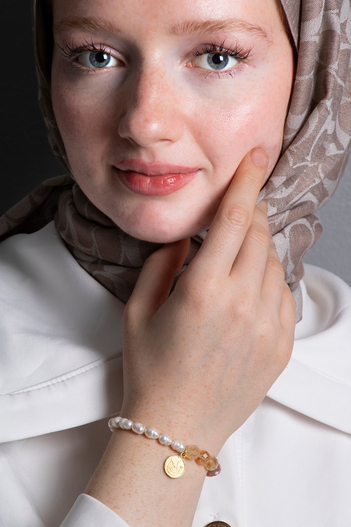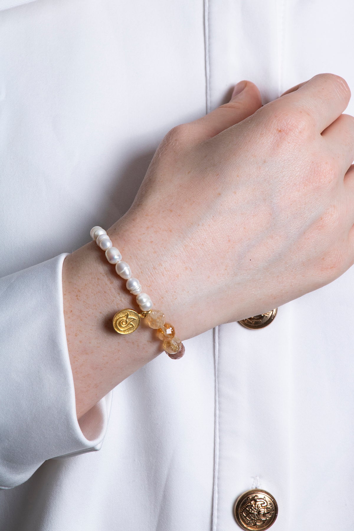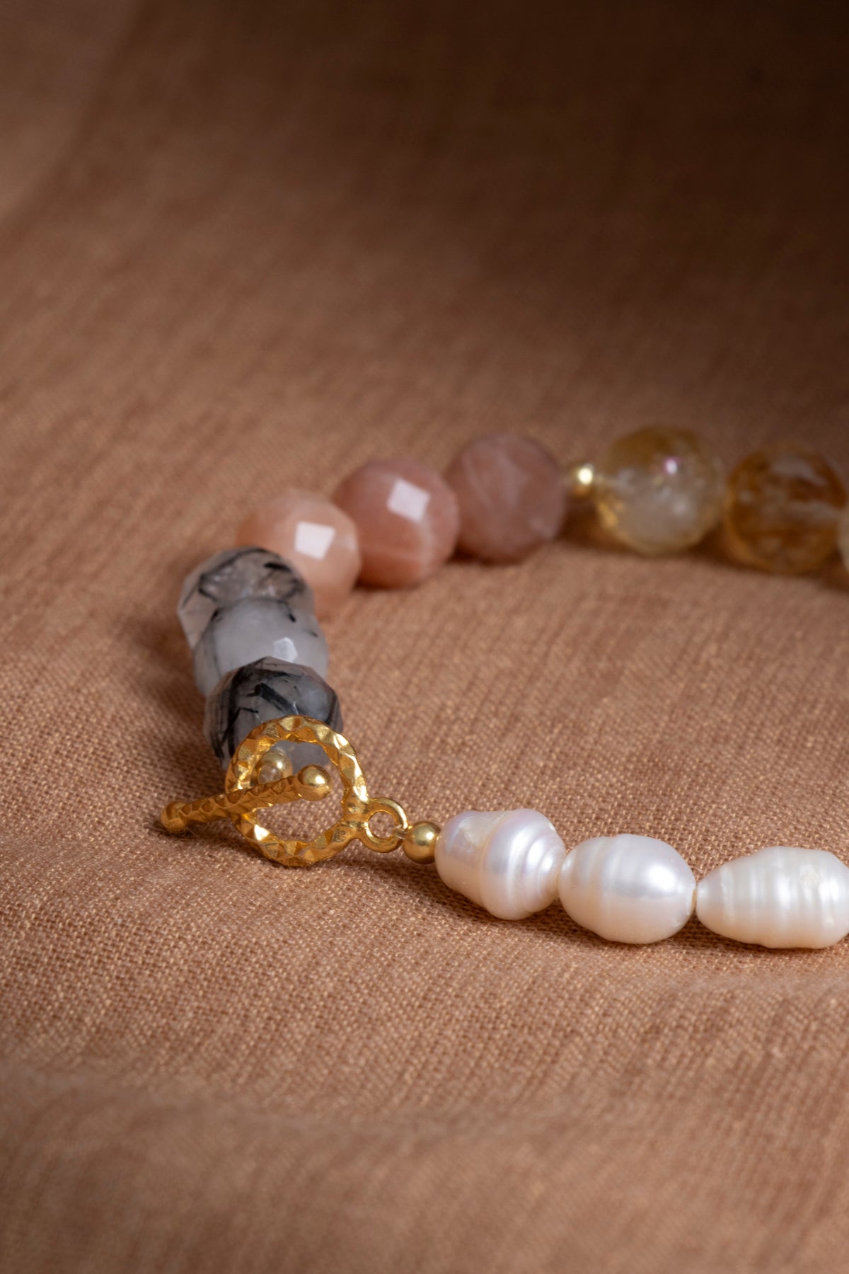 SAKRAL ÇAKRA Bilekliği: Güneş Taşı, Sitrin, Rutilli Kuvars, İnci Gümüş Charm ve Aparatlı Doğal Taş Bileklik