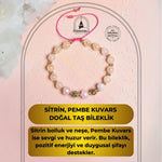 Sertifikalı doğal Sitrin taşı bolluk ve neşe getirirken, Pembe Kuvars sevgi, şefkat ve duygusal dengeyi temsil eder. Işıltılı zirkon aparat detaylarıyla tamamlanan bu tasarım, hem zarif hem de güçlü bir enerji alanı sunar.