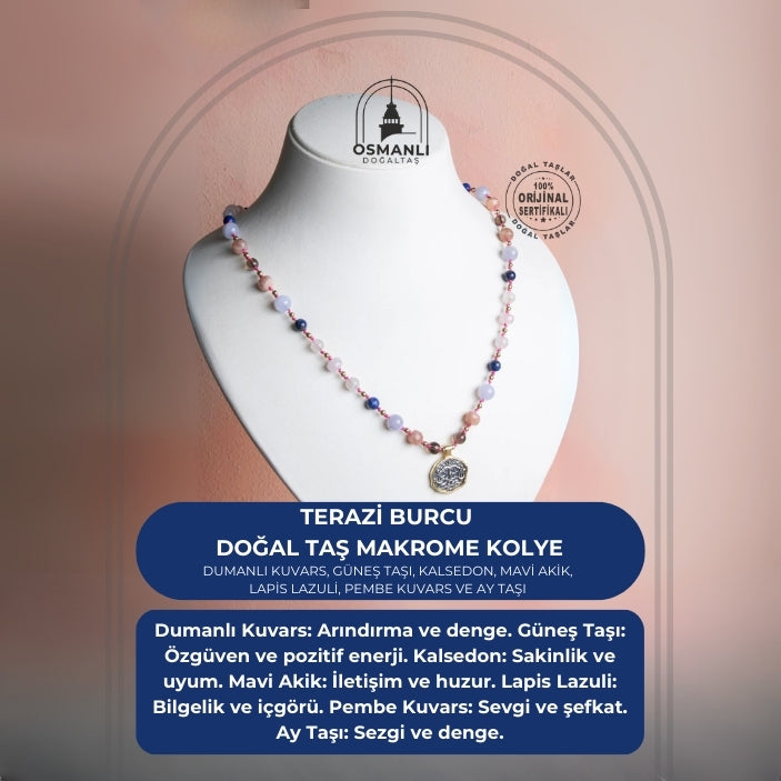 Denge, zarafet ve uyum... Terazi burcunun estetik, adaletli ve sevgi dolu enerjisini yansıtan bu özel makrome kolye; Dumanlı Kuvars, Güneş Taşı, Kalsedon, Mavi Akik, Lapis Lazuli, Pembe Kuvars ve Ay Taşı enerjisiyle tasarlandı.