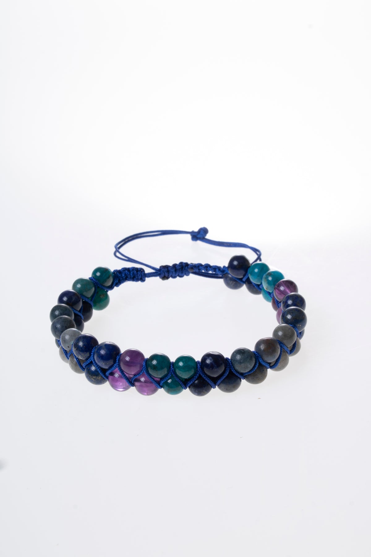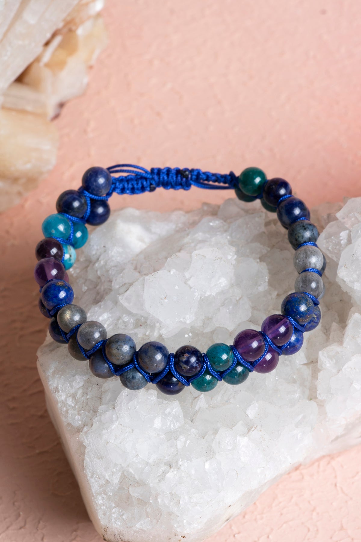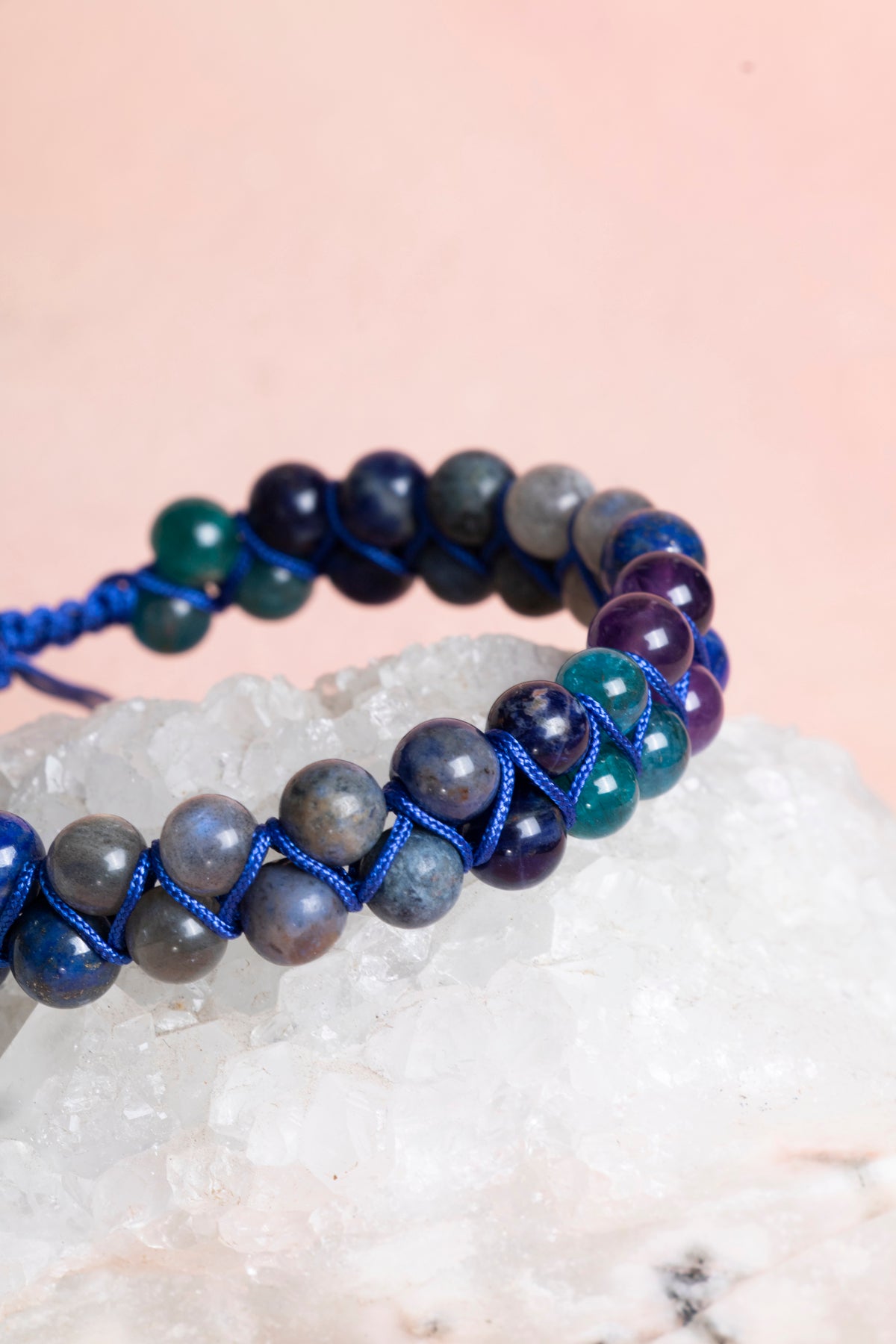 Bileklik, zihinsel netliği ve sezgisel gücü destekleyen, %100 doğal ve sertifikalı Mavi Apatit, Sodalit, Labradorit, Lapis Lazuli, Ametist ve Dumortierit taşları (6mm) ile elde örüldü. Bu taşların birleşimi, üçüncü göz çakranızı aktive ederek daha derin bir anlayış ve içsel rehberlik sağlar.