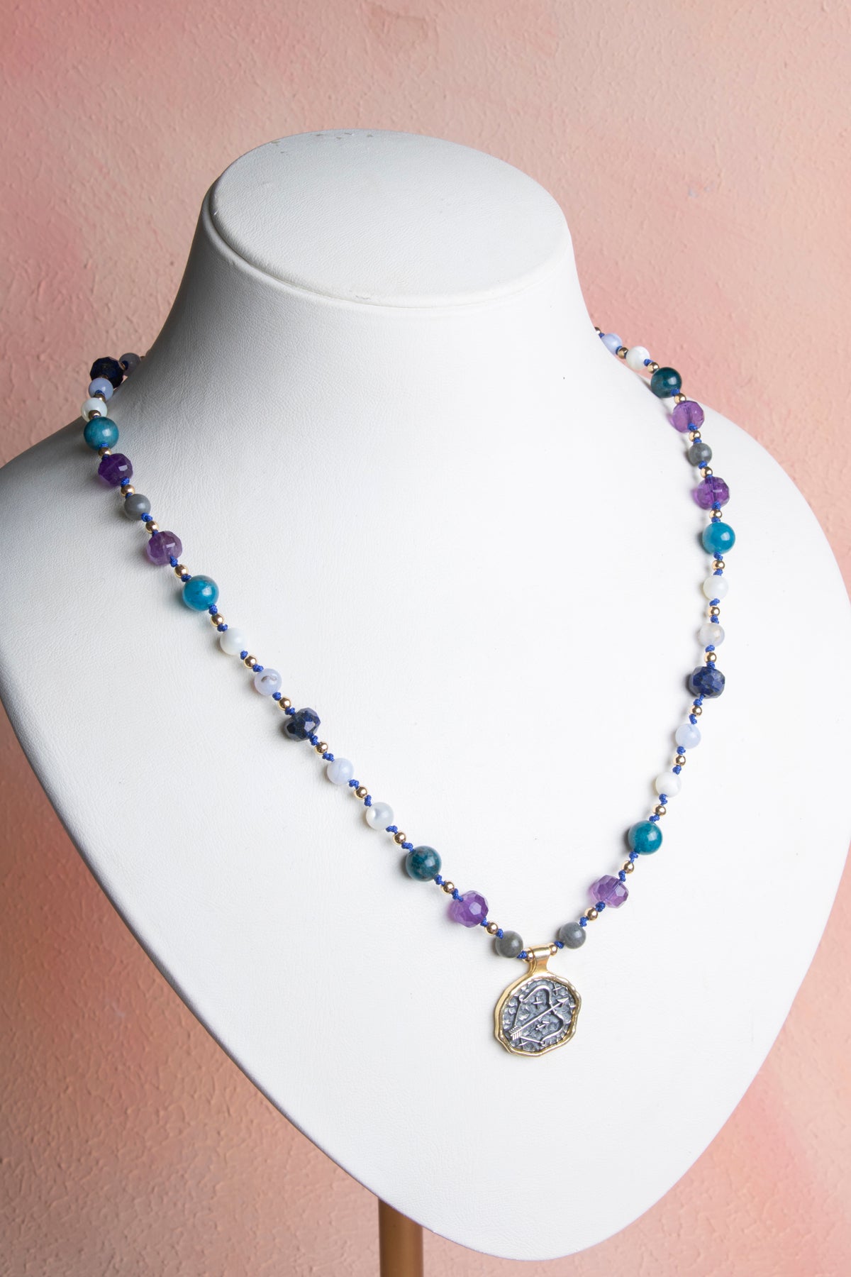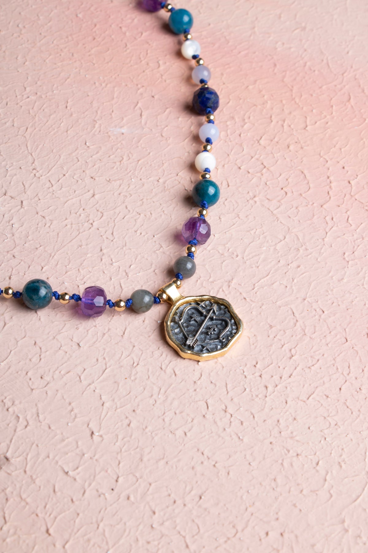 Bu özel kadın kolyesi, Yay burcunun cesur, neşeli, meraklı ve yeni ufuklar arayan doğasına hitap eden doğal taşlarla tasarlandı: