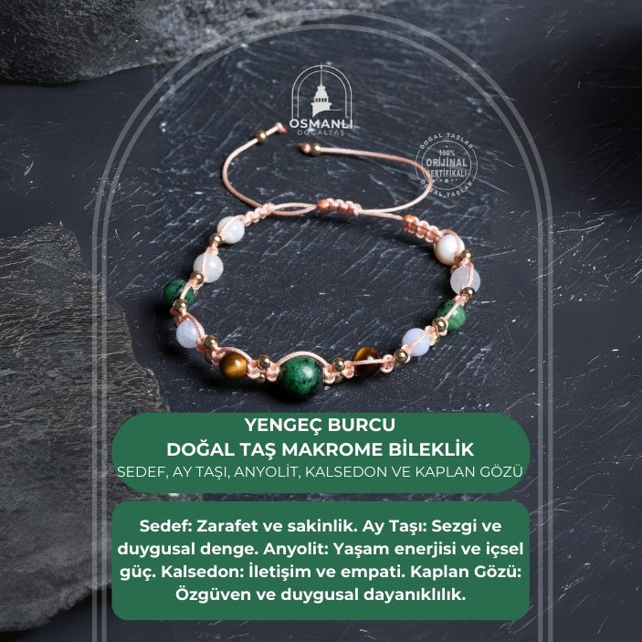 Bu taşların dengeli birleşimi, Yengeç burcunun duygusal hassasiyetini desteklerken, içsel güç ve sezgisel dengeyle tamamlanır. %100 doğal ve sertifikalı taşlarla hazırlanmış bu özel bileklik, el işçiliğiyle örülen makrome tasarımı sayesinde hem şık hem dayanıklıdır.