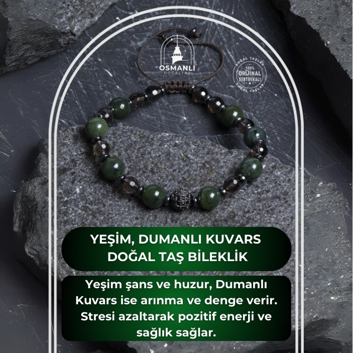 Yeşim taşı, yüzyıllardır huzur, bolluk ve kalp enerjisiyle ilişkilendirilirken; Dumanlı Kuvars, negatif enerjileri uzaklaştırarak topraklama ve zihinsel berraklık sağlar.