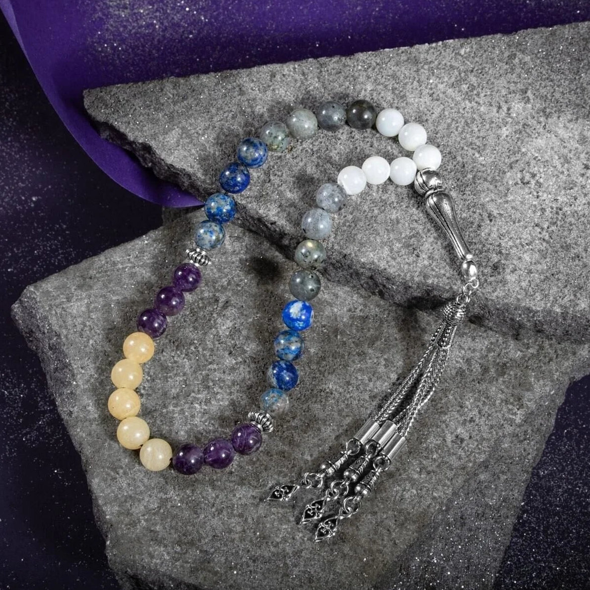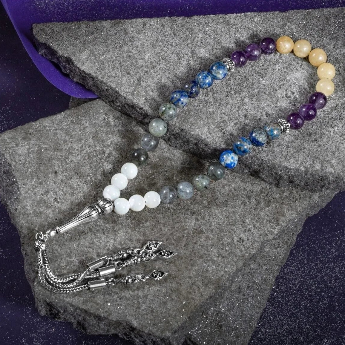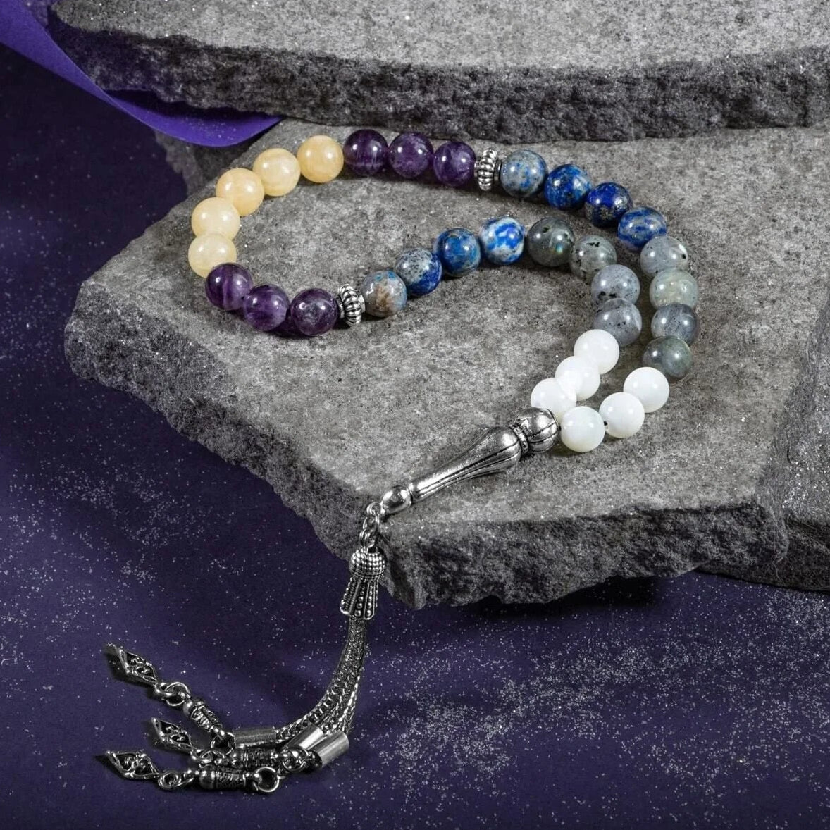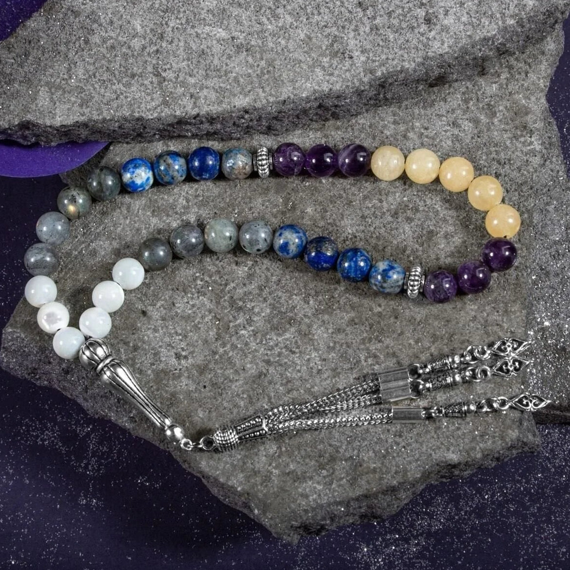 Yay Burcu Tesbih Ametist, Kalsit, Labradorit, Lapis Lazuli, Sedef