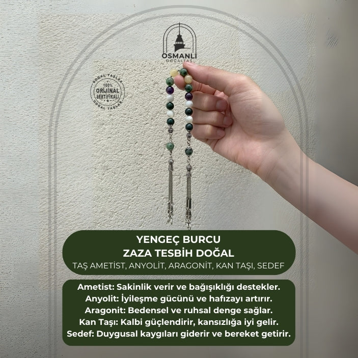 Yengeç Burcu Zaza Tesbih Doğal Taş Ametist, Anyolit, Aragonit, Kan Taşı, Sedef