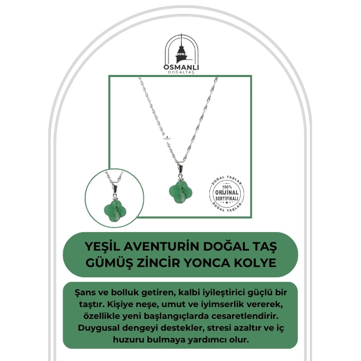 Yeşil Aventurin Doğal Taş Gümüş Zincir Yonca Kolye